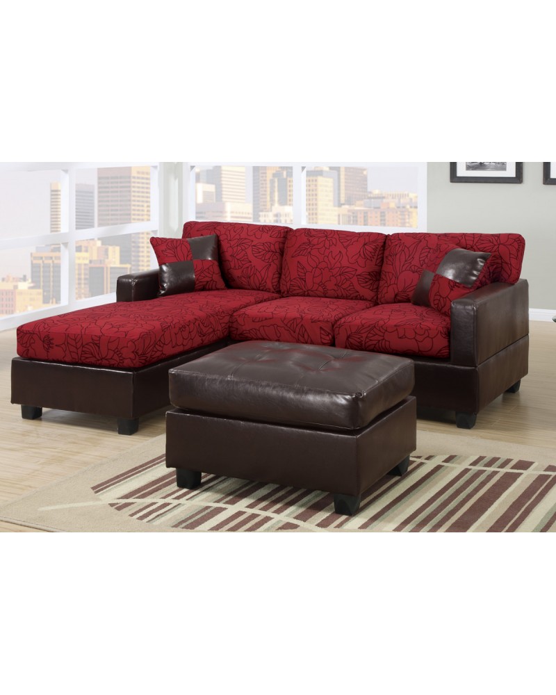 Embellished in a floral outlined print, this red fabric lined 3-piece sectional is a luxurious piece of finishing art. Crafted for a dramatic setting, it also features a bold chocolate faux leather base and accent pillow covered in a block design of the same floral print and solid chocolate brown faux leather. This product has been discontinued. ..